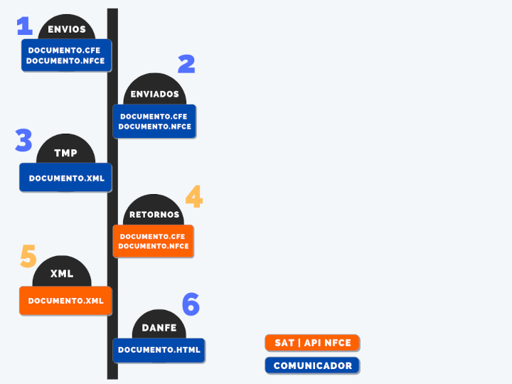 - A API faz uma primeira validação do formato dos dados. Se houver alguma inconsistência, é devolvida uma mensagem de erro. Se estiver tudo ok, o documento é aceito para processamento posterior. Ou seja, ele vai para uma fila onde será eventualmente processado.